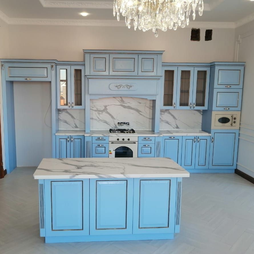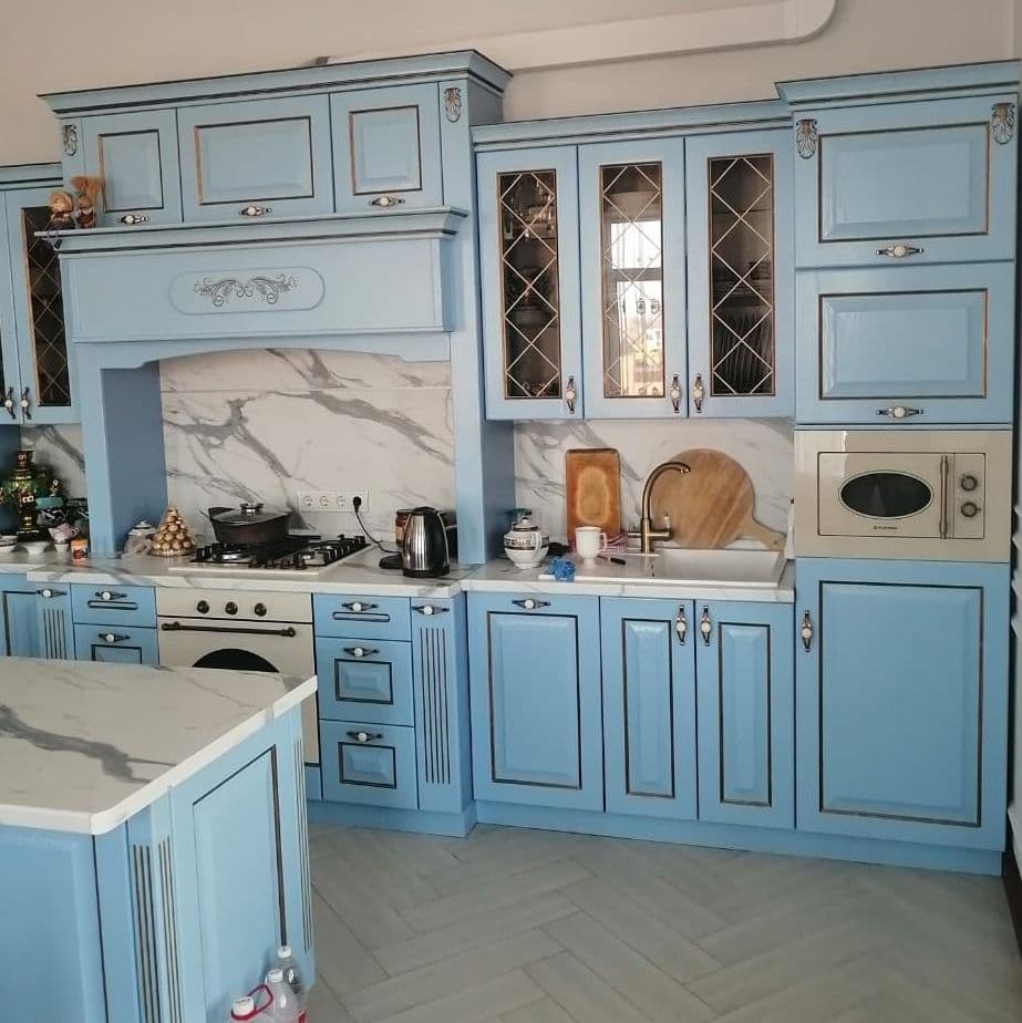 Стиль фасадов – классический или кантри, с филенчатыми дверцами или простыми прямоугольными формами. Возможны декоративные элементы, такие как карнизы или пилястры, но в умеренном количестве, чтобы не перегружать интерьер.